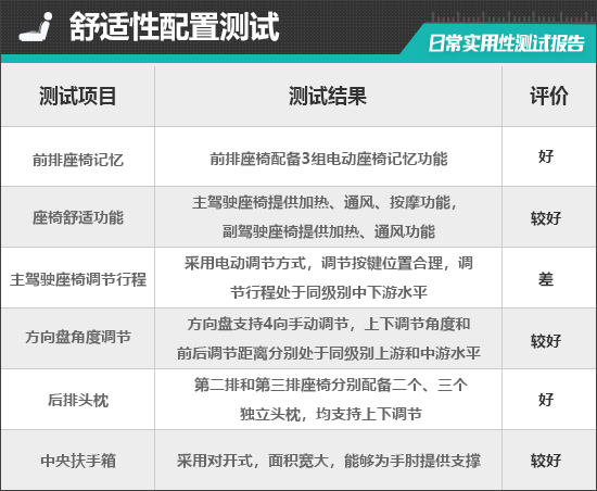 座椅方面,评测车前排座椅调节按键位于座垫侧面,位置合理且操作方便,均配备了电动座椅记忆功能。座椅舒适功能上,评测车主驾驶座椅提供加热、通风、按摩功能;副驾驶座椅提供加热、通风功能,可以提供不错的乘坐舒适性。