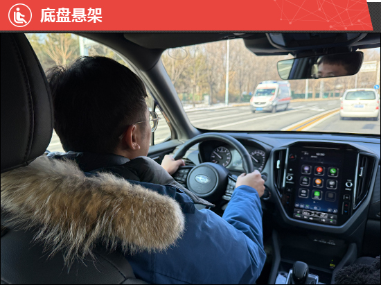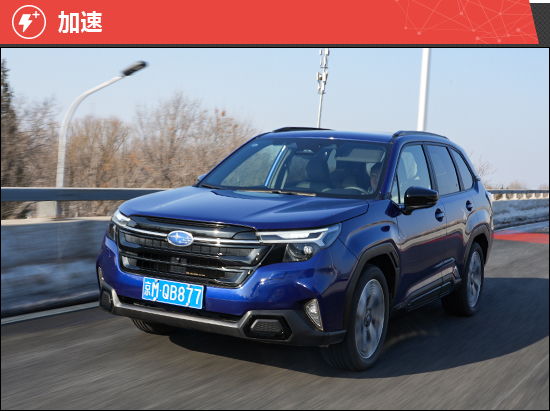 评测车搭载2.5L水平对置四缸发动机,最大功率122kW,最大扭矩252N·m,传动系统匹配可模拟8速的CVT变速箱,并带有全时四驱系统。实测动力输出相对比较平顺,即便全力加速也难有明显的推背感,整体调校偏向沉稳风格。