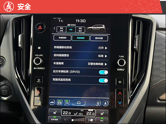 评测车搭载斯巴鲁EyeSight视驭驾驶辅助系统,提供紧急自动转向辅助、车道居中保持以及起步油门误操作预防等功能。实测全速自适应巡航跟车距离提供4档可调,最近档位与前车间距较远,容易被其他社会车辆加塞。