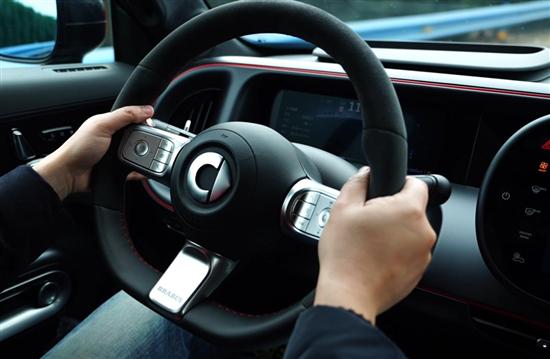 驾驶员首先接触的是方向盘。精灵#5的方向盘从左到右2.5圈,直径也比较友好,用麂皮提升摩擦力后的BRABUS版本更显紧绷,尺度刚好的握感,以及三六点舒适的凹槽,让手掌搭上去就找回燃油性能车般的战斗气息。