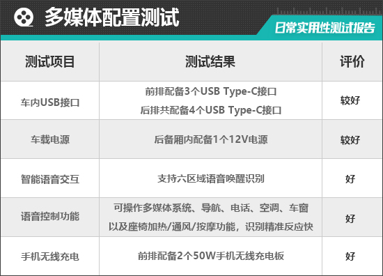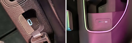在车内USB接口方面,评测车前排配备3个USB Type-C接口;后排共计配备4个USB Type-C接口,第二排和第三排各2个。虽然数量较多,但是接口种类单一,存在优化空间。