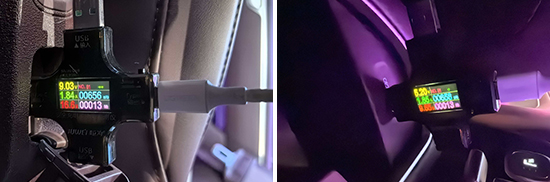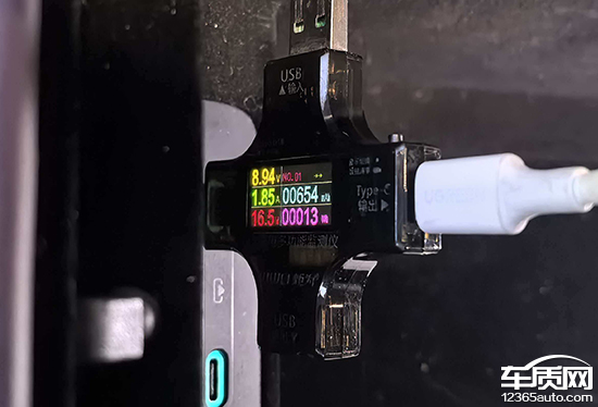 同时,我们对USB接口的电压、电流和功率进行了测试。前排USB Type-C接口充电功率16.5W,电压8.94V、电流1.85A;第二排USB Type-C接口充电功率16.6W,电压9.03V、电流1.84A;第三排USB Type-C接口充电功率9.65W,电压5.2V、电流1.85A。