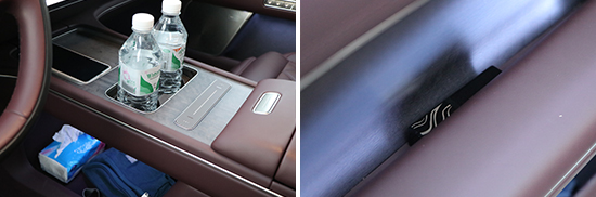 评测车在前排配备了2个50W手机无线充电板,位置合理,拿取手机十分方便,并且底部还设计有散热口。充电板支持开启/关闭功能,通过语音指令和屏幕内的开关均可进行控制。