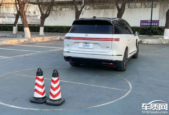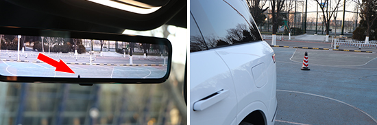 后方视野测试中,依旧将桩桶固定摆放,随后移动车辆直至可以观察到桩桶上沿为止。经实测,得益于流媒体后视镜,评测车后方视野所测得的距离为6.535m,在测试过的同级别车型中处于上游水平。