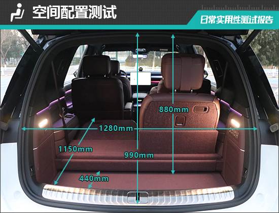 后备厢内部造型较为规整,第三排座椅支持比例放倒,能够进一步拓展后备厢空间。对于评测车后备厢的基础数值,我们也进行了实测,开口宽度为1280mm,开口长度为990mm;后备厢进深为440-1150mm;后备厢地台与顶部的垂直高度为880mm。