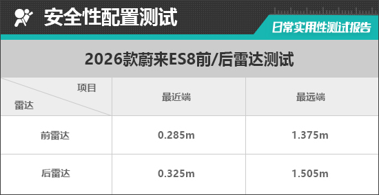前雷达在1.375m处可感应到物体,雷达功率表现同样值得肯定。从实测数据来看,前雷达最近提示距离为0.285m,未达到同级别车型平均水平。