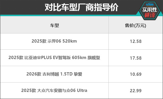 紧凑型SUV始终是国内关注度最高的细分市场之一,随着新能源时代的到来,价格不断下探、产品力持续提升,这一市场也涌现出越来越多表现出色的车型。在往期的《日常实用性测试》中,我们曾测试过多款紧凑型SUV。本次,我们将选取示界06、比亚迪宋PLUS EV、吉利博越、大众汽车安徽与众06(以下简称:大众与众06)四款车型,通过横向对比,看看哪款车型的实用性表现更加出众。
