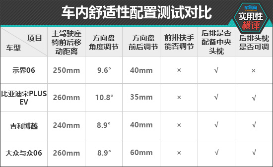 主驾驶座椅前后移动距离方面,比亚迪宋PLUS EV和大众与众06的测试数值均为260mm,并列第一。排名垫底的是吉利博越,距离仅有240mm。方向盘调节方面,比亚迪宋PLUS EV的上下调节角度达到10.8°,领先其他三款车型;但其前后调节距离仅为35mm,为四车中最短。大众与众06的前后调节距离位列第一,测试成绩达到了60mm。