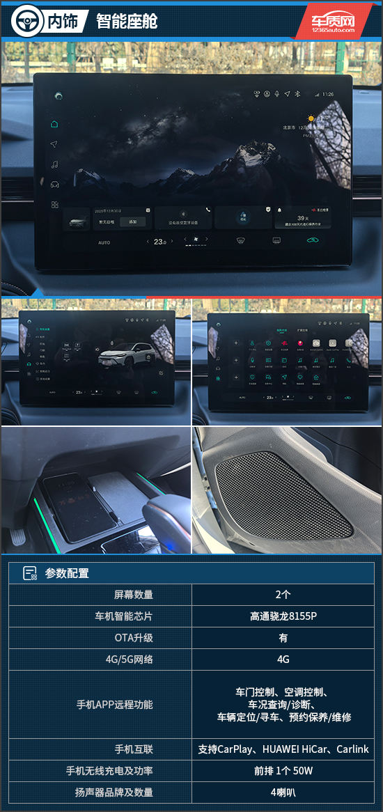 评测车的12.9英寸中控屏和8.8英寸仪表屏,可以直观操控、查看车辆众多功能。重点升级在于车机系统进行了全面焕新,UI界面更美观,而且内置高通骁龙8155P芯片,响应更迅速,可实现双区域语音唤醒识别、语音连续识别、可见即可说、声纹识别等功能,还兼容CarPlay、HUAWEI HiCar、Carlink多种手机互联方式,交互感出色。此外,评测车还提供了1个50W无线充电板,扬声器数量为4个。