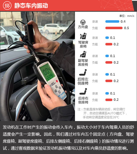 在静态车内振动测试环节,怠速状态下方向盘处的振动数值为0.4mm/s,负载状态下提升至0.5mm/s,振动感受明显。而车内座椅的振动数值处于较低水平且两种状态下变化不大,对乘坐舒适性未造成影响。