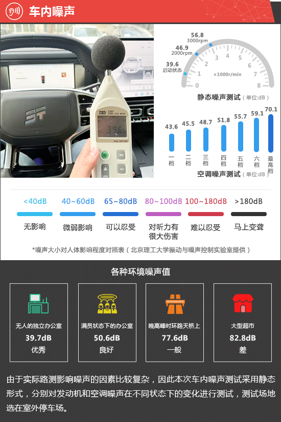 在静态噪声测试环节,评测车在启动状态下车内实测噪声值为39.6dB,在测试过的同级别车型中处于中下游水平。从测试数据来看,发动机在2000rpm和3000rpm时,传入车内的噪声值分别为46.9dB和56.8dB,整体表现处于同级别车型中游水平。