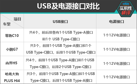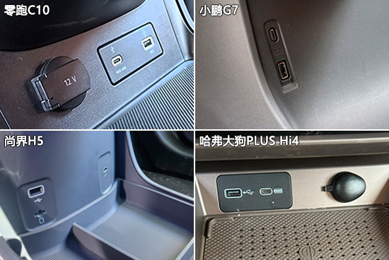 充电接口方面,零跑C10全车配备4个USB接口,且前后排接口涵盖Type-A和Type-C两种类型,实用性表现可圈可点。尚界H5虽然同样配备4个USB接口,但后排为单一类型接口,兼容性表现不佳,另外两款车型的不足之处在于后排仅提供1个USB接口。12V电源接口方面,四款车型均配备了1个12V电源接口。