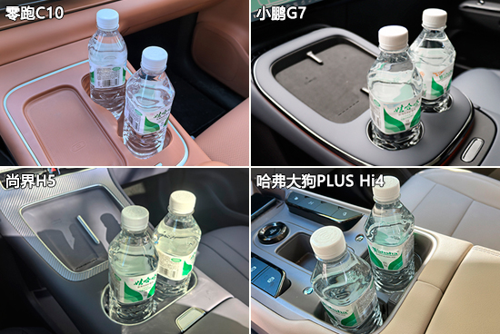 杯架测试中,四款车型整体表现不错,所有杯架都带有限位器,可以有效固定水杯或水瓶。数量方面,哈弗大狗PLUS Hi4的表现要优于另外三款车型。