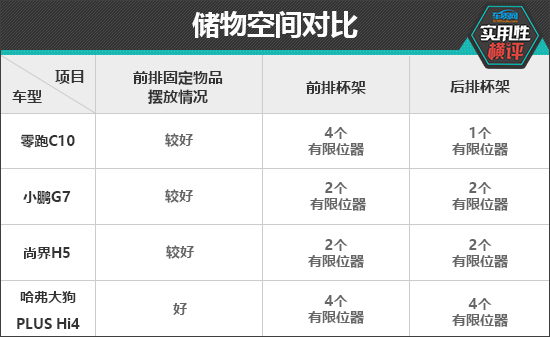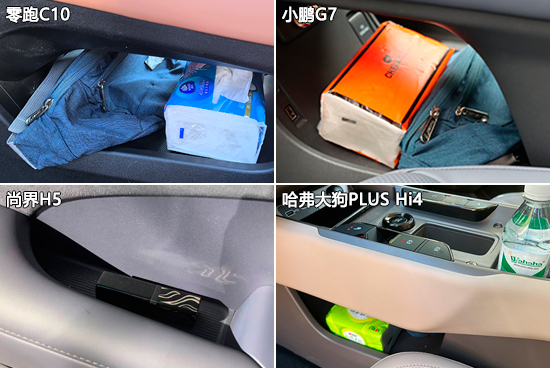 车内储物空间方面,哈弗大狗PLUS Hi4整体表现最好,上述固定物品均有合适的储物空间进行摆放。其余三款车型因未配备眼镜盒,所以墨镜没有合适的地方放置。四款车型的车内储物空间位置设计合理,日常使用便利性值得肯定。