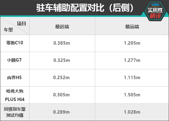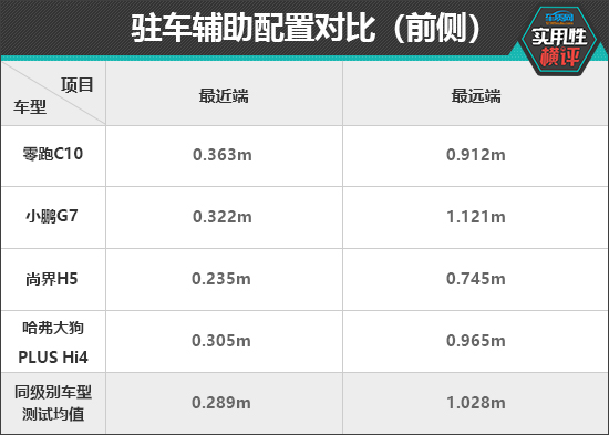 驻车辅助配置方面,在前方驻车雷达测试中,小鹏G7的最远探测距离为1.121m,雷达功率表现较好。在最近提示距离方面,哈弗大狗PLUS Hi4与同级别车型测试均值更为接近。