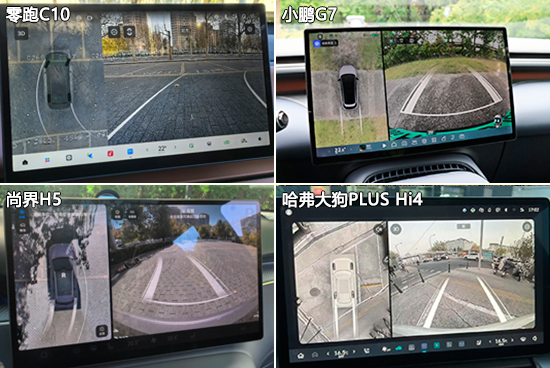 在影像辅助系统方面,四款车型均配备360度全景影像系统,画面清晰度值得肯定;同时,在畸变控制方面的表现也都可以让人满意。值得一提的是,四款车型的影像画面内均带有可随动的倒车辅助线,能够为驾驶员提供参考。