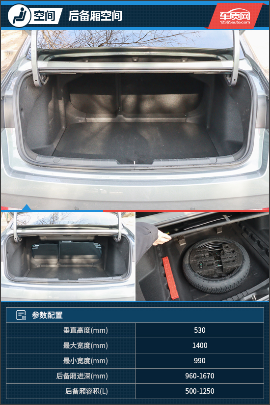 打开后备厢,内部比较规整,常规状态下容积为500L,可容纳3-4个登机箱,将后排座椅比例放倒后,容积可扩展至1250L,放置一些大件物品不成问题。