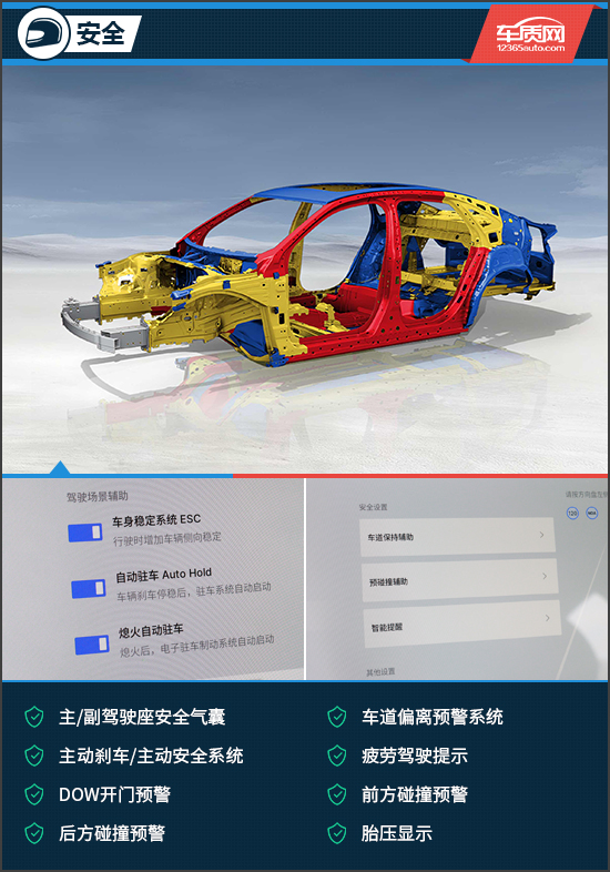 安全方面,评测车的主/被动安全配置较为齐全,配备车道偏离预警系统、主动刹车/主动安全系统、疲劳驾驶提示以及前方碰撞预警等。与此同时,星瑞东方曜还采用高强度笼式车身,拥有29000N·m/deg车身扭转刚度、高强度钢占比70.2%,大幅提升碰撞时的座舱防护能力。