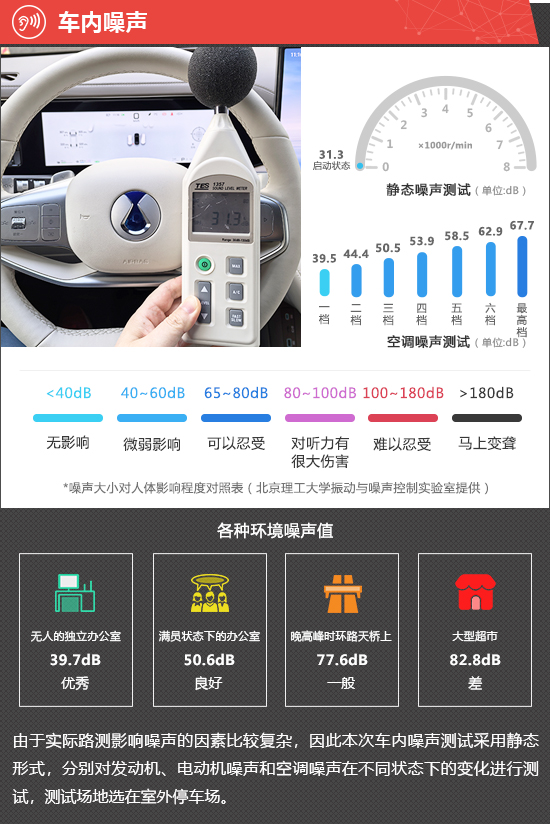 在静态噪声测试环节,2025款腾势N8L在启动状态下车内实测噪声值为31.3dB,在测试过的同级别车型中处于中上游水平。由于评测车搭载插电式混合动力系统,启动状态下发动机默认不工作,因此无法对2000rpm以及3000rpm的噪声进行测试。