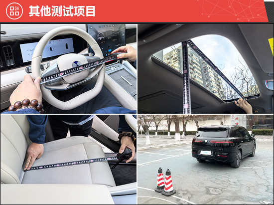 此外,我们还针对驻车雷达、灯光/视野、操控系统、轮胎、天窗、座椅、后备厢进行了测试。经过测试,2025款腾势N8L主驾驶座椅和方向盘调节范围较大,可以适应不同身高的驾驶者。评测车配备普利司通泰然者6轮胎,主打舒适静音和湿滑路面强劲抓地力表现,轮胎规格为265/45 R21。相对而言,两侧外后视镜视野范围角度未达到同级别车型测试均值,有待优化。