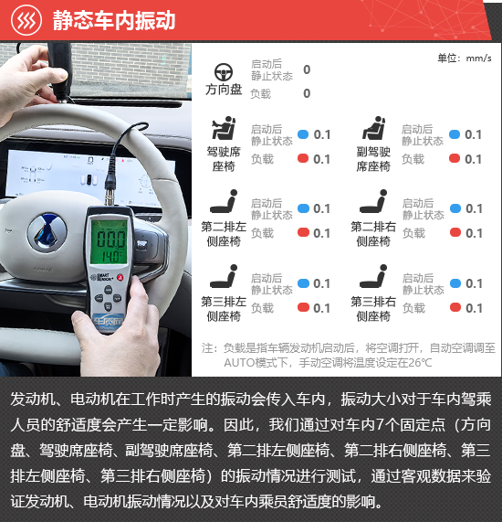 在静态车内振动测试环节,启动后静止和负载两种状态下,2025款腾势N8L方向盘位置的振动数值始终为0,前后排座椅的振动数值均为0.1mm/s,并且保持不变,实际体感不明显。
