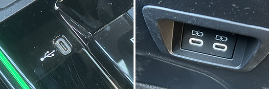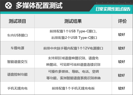 评测车共配备3个USB接口,其中,前排配备1个USB Type-C接口,后排配备2个USB Type-C接口。整体数量表现中规中矩,且接口类型较为单一。同时,前排中央扶手箱内还配备1个12V电源接口,能够满足车内乘客多种电子设备的用电需求。