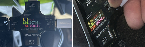 此外,我们对USB接口进行了测试。其中,前排USB Type-C接口的充电功率为9.84W,电压为5.14V,电流为1.91A。后排USB Type-C接口的充电功率为9.78W,电压为5.1V,电流为1.91A。