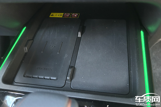 评测车前排杯架前方配备了1个手机无线充电板,位置设计合理,驾驶员拿放手机方便。充电功率为50W,提供通风散热口和开启/关闭功能,实用性不错。