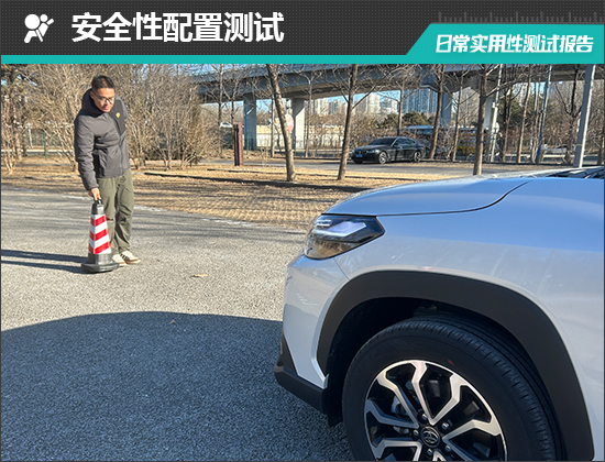在前方视野测试中,我们采用高70cm的桩桶作为参照物,随后调整车距,直至在主驾驶位可以看到桩桶上沿。经过测试,桩桶与车头最终测得的数据为2.945m,在测试过的同级别车型中处于中下游水平。