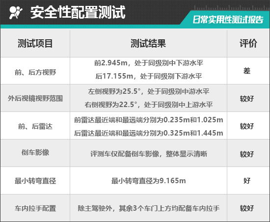 在车辆前、后方视野测试中,车内所有座椅均已调整至最低状态,所测出的数据与驾驶者正常使用时均有一些偏差,仅供参考。