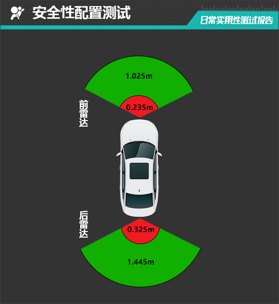 前雷达最远可以在1.025m处感应到前方物体,雷达功率表现不错;最近端感应距离为0.235m,表现同样未达到同级别车型平均水平。