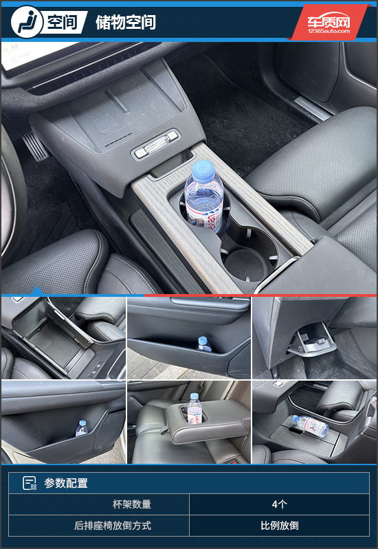 储物表现方面,评测车展现出了较高的空间利用率。前排滑动中控台在打开状态下提供带盖板的双杯架,收起后则形成前文提到的大尺寸下沉储物空间,兼顾灵活性与实用性。此外,在转向柱左侧以及后排空调出风口下方,其还设置了小型储物格,便于乘员放置随身物品。