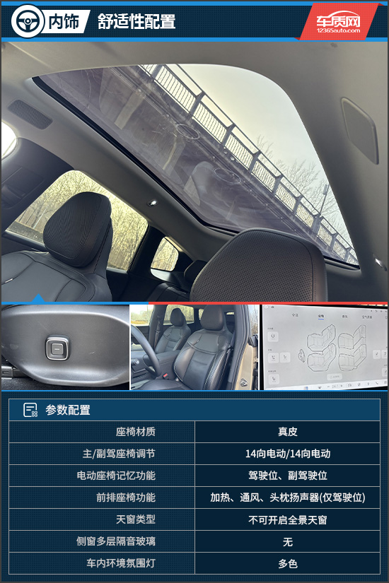 舒适性配置方面,评测车配备不可开启全景天窗,并提供电动遮阳帘,兼顾座舱通透感与防晒需求。前排座椅支持加热、通风,驾驶位还配备头枕扬声器,配合柔软的填充物以及电动腿托,乘坐舒适性与身体支撑性表现到位。此外,方向盘及后排座椅均支持加热功能,对全车乘员的照顾较为周到。