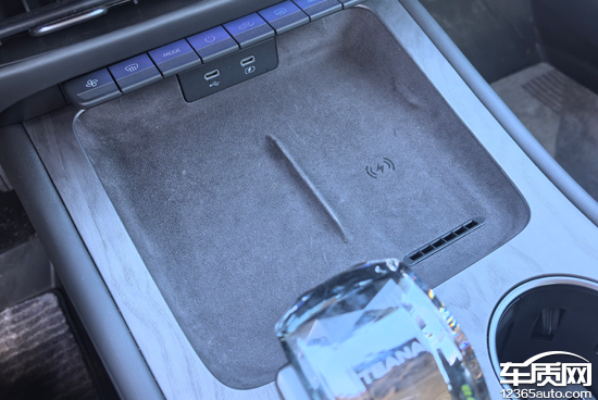 评测车前排杯架前方配备了1个手机无线充电板,位置设计合理,驾驶员拿放手机方便。充电功率为50W,提供通风散热口和开启/关闭功能,实用性不错。