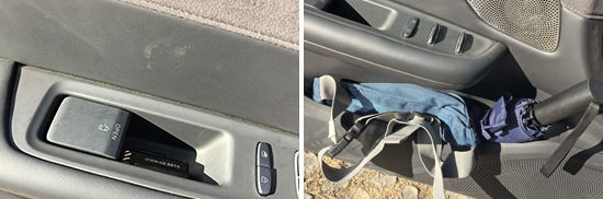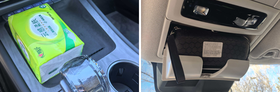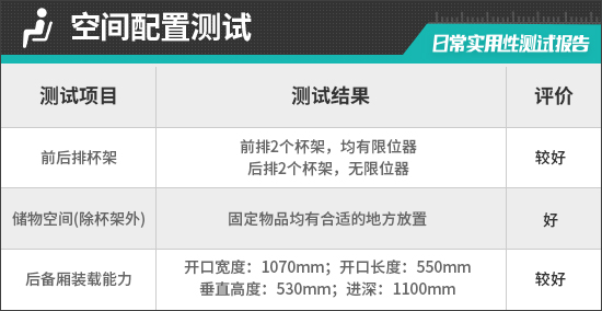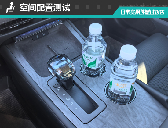 对于车内使用空间的测试,只针对前排触手可及的空间,不包括手套箱、中央扶手箱等需开启的空间。测试方法是将以下固定物品全部放置在前排的各个储物空间内,通过固定物品的放置情况来判断车辆储物空间的表现。测试选定的固定物品为:2瓶常规大小的矿泉水、1部大屏手机、1支口红、1个挎包、1副墨镜、1把折叠雨伞以及1包常规尺寸的抽纸。