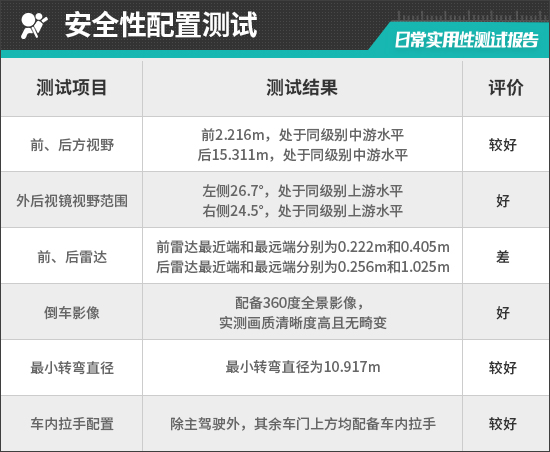 在车辆前、后方视野测试中,车内所有座椅均已调整至最低状态,所测出的数据与驾驶者正常使用时均有一些偏差,仅供参考。