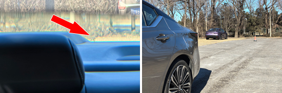 在前方视野测试中,我们采用高70cm的桩桶作为参照物,随后调整车距,直至在主驾驶位可以看到桩桶上沿。经过测试,桩桶与车头最终测得的数据为2.216m,在测试过的同级别车型中处于中游水平。