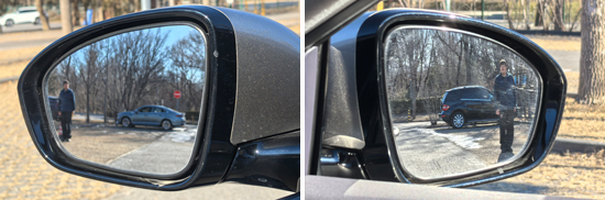 评测车的左/右外后视镜采用普通镜片,经实测,左、右外后视镜视野范围分别为26.7°和24.5°,在测试过的同级别车型中均处于上游水平。