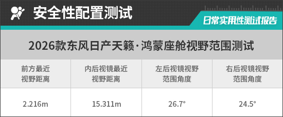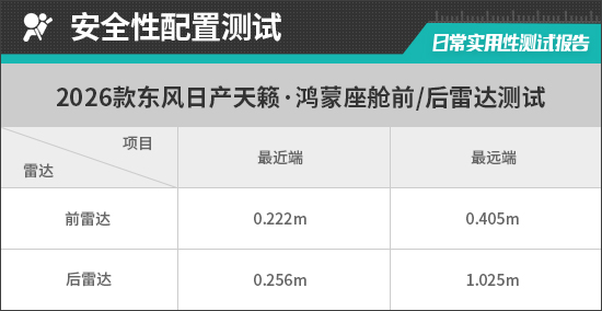 通过测试不难看出,2026款东风日产天籁·鸿蒙座舱拥有完备的前排座椅舒适功能、宽广的外后视镜视野范围以及丰富的储物空间。但还存在前雷达功率不足、充电接口种类单一、后排座椅不支持比例放倒等问题。综合来看,2026款东风日产天籁·鸿蒙座舱的实用性表现符合预期,可以满足家庭日常使用所需。