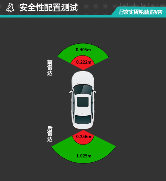 前雷达最远可以在0.405m处感应到前方物体,雷达功率表现较差;最近端感应距离为0.222m,表现达到同级别车型平均水平。