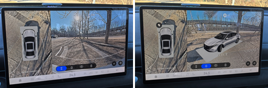 评测车配备了360度全景影像,支持多角度查看。经实测,影像显示清晰,车辆周围的畸变控制也在合理范围内,整体表现达到行业平均水平,可以在泊车时给驾驶者提供帮助。