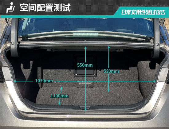 后备厢内部造型较为规整,平整度不错。略显遗憾的是,评测车后排座椅并不支持比例放倒。对于评测车后备厢的基础数值,我们也进行了实测,开口宽度为1070mm,开口长度为550mm;后备厢进深为1100mm;后备厢地台与顶部的垂直高度为530mm。