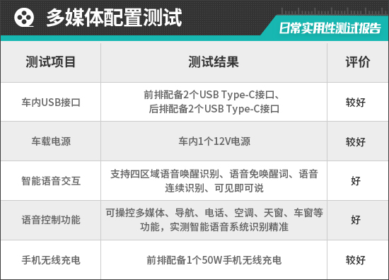 评测车共配备4个USB接口,其中,前排配备2个USB Type-C接口,后排配备2个USB Type-C接口,接口数量可圈可点但种类单一。同时,车内还有1个12V电源接口,基本能够满足车内乘客电子设备的用电需求。
