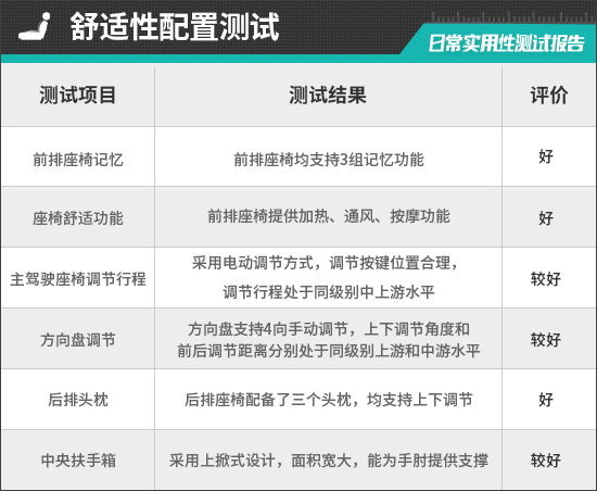 座椅方面,评测车前排座椅电动调节按键位于座垫侧面,位置合理且操作方便,均配备3组电动座椅记忆功能。座椅舒适功能上,评测车前排座椅提供加热、通风、按摩功能,日常用车时可以提供不错的乘坐舒适性。
