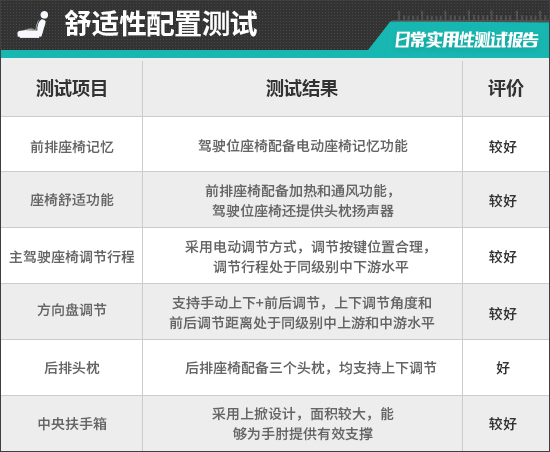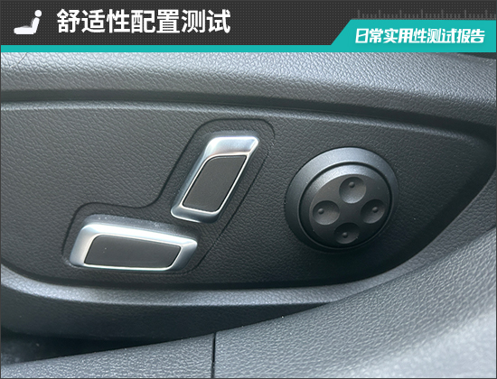 座椅方面,评测车前排座椅调节按键位于座垫侧面,调节按键位置合理,操作便捷。此外,评测车驾驶位座椅支持电动座椅记忆功能;同时,前排座椅配备加热和通风功能,驾驶位座椅还提供头枕扬声器,舒适性表现较好。