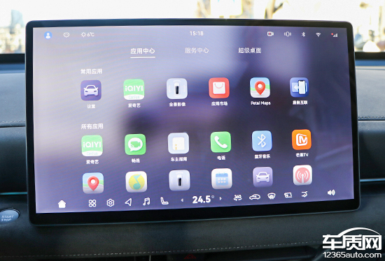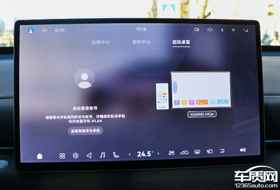 桌面布局简约精致,整体采用大卡片搭配Dock栏的设计方案,交互逻辑十分清晰。应用界面内共有三个分类,包括应用中心、服务中心以及超级桌面。除服务中心外,在桌面长按Dock栏图标也能进入设置界面,用户可以根据个人喜好和使用习惯进行功能选择和位置调整。超级桌面的使用前提是需要登录与手机相同的华为账号,并确保车机与手机均开启蓝牙和WLAN。连接后,可以通过中控屏直接操作手机内的APP,实现跨设备协同资源共享。