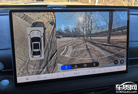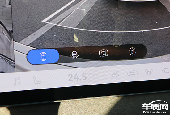 评测车配备360°全景影像,支持多角度显示。实测影像画面清晰度表现出色,并且畸变控制也比较得当。功能性方面,画面内带有随动倒车辅助线,可以为驾驶员提供有效参考。