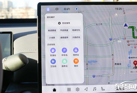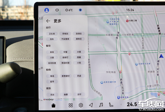 评测车内置高德地图以及华为旗下的Petal Maps花瓣地图,相比之下还是前者的使用人数更多。高德地图作为导航应用界的“一哥”,实用性表现确实毋庸置疑。搜索栏位于左上角,支持多种输入方式。系统内还提供丰富的快捷目的地选择,涵盖出行、餐饮、购物、娱乐等多个领域,完全能够满足日常使用所需。
