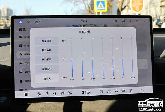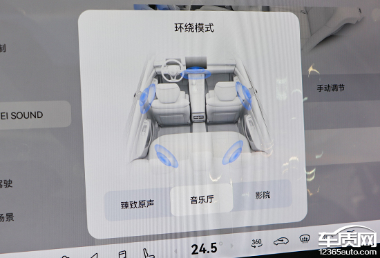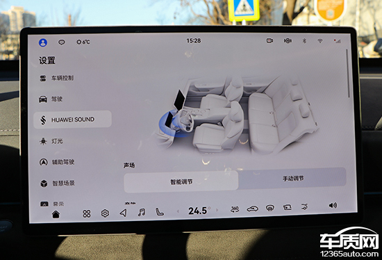 评测车配备HUAWEI SOUND音响系统,拥有17个扬声器。软件方面,系统内提供了相当丰富的调节内容,包括声场以及音效模式等。此外,其还支持无麦K歌,能够一键开启录音棚音效,可玩性很强。