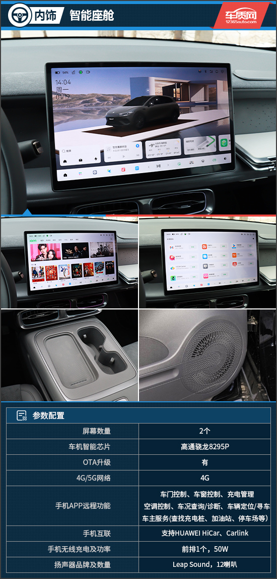 评测车中控台前方设置了一个手机槽,拿放手机十分顺手,并支持50W无线充电;Leap Sound扬声器数量达到12个,具备7.1声道以及自研AI音效算法,电音更猛、细节更轻,人声更近。